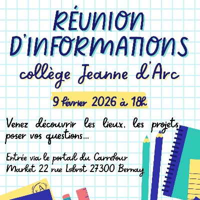 Réunion d'informations pour les futurs 6èmes Veuillez trouver ci-joint l'invitation pour une réunion d'informations pour les parents de CM1 et CM2 le 9 février 2026 à 18h sur le site du collège Jeanne d'Arc (adresse sur l'affiche).